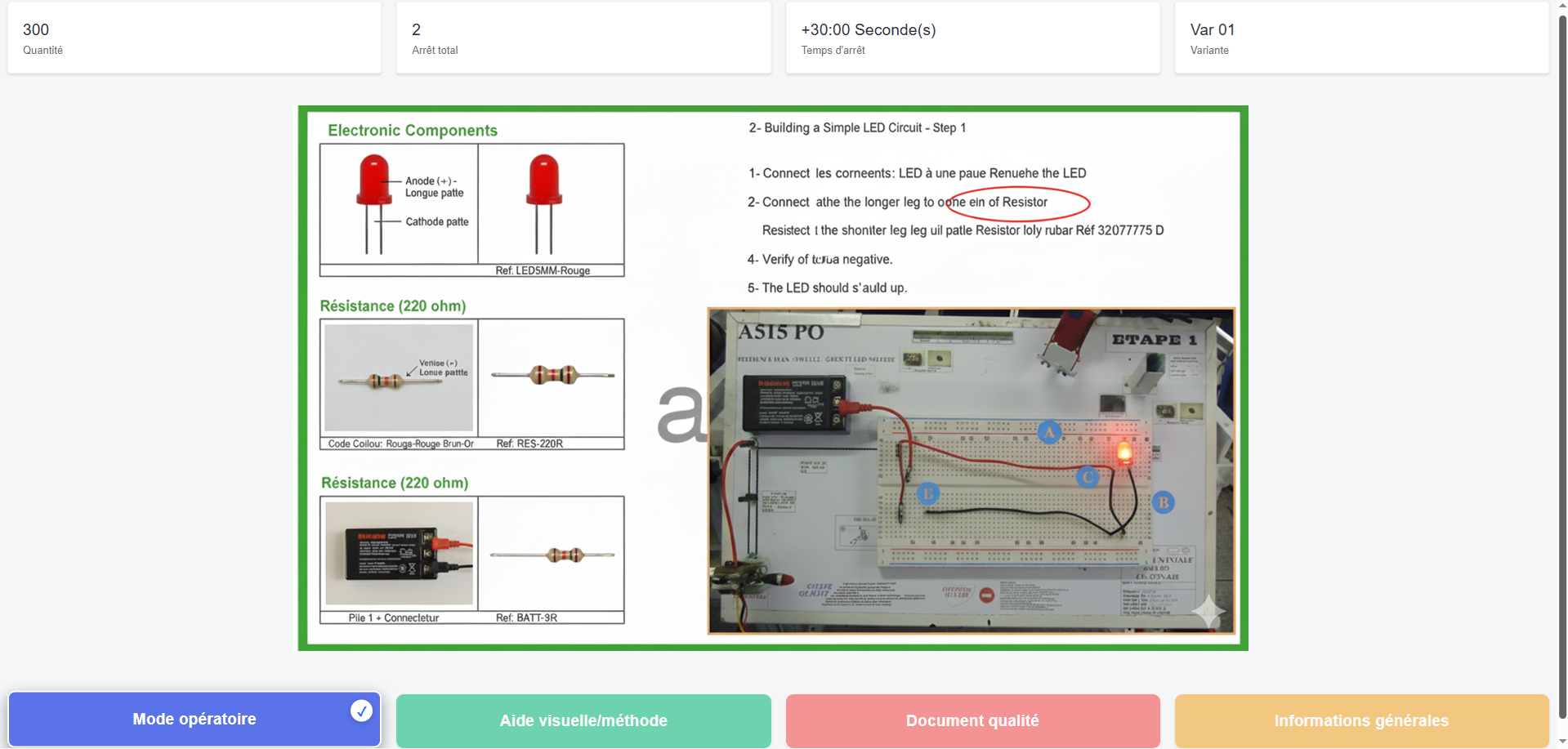 Composants, codage couleur, orientation, schémas annotés, photo du résultat final. L’opérateur comprend le bon geste en quelques secondes.