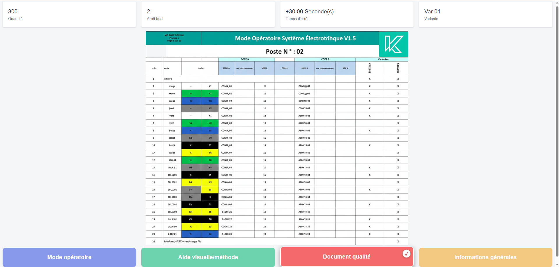 Mode opératoire en plein écran, quantité prévue, arrêts, temps d’arrêt et variante. Cette clarté réduit fortement les erreurs d’exécution et les pertes de temps.