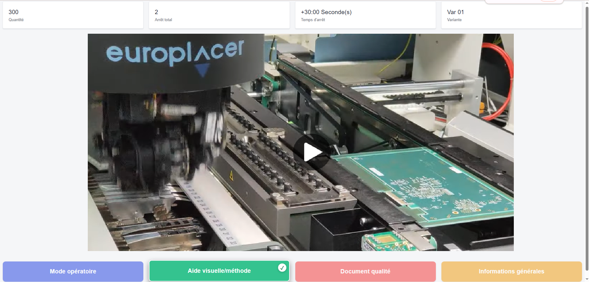 Une vidéo Europplacer intégrée directement dans l’écran. L’opérateur visualise la cadence, les mouvements, les points critiques. Il reproduit le geste avec précision.