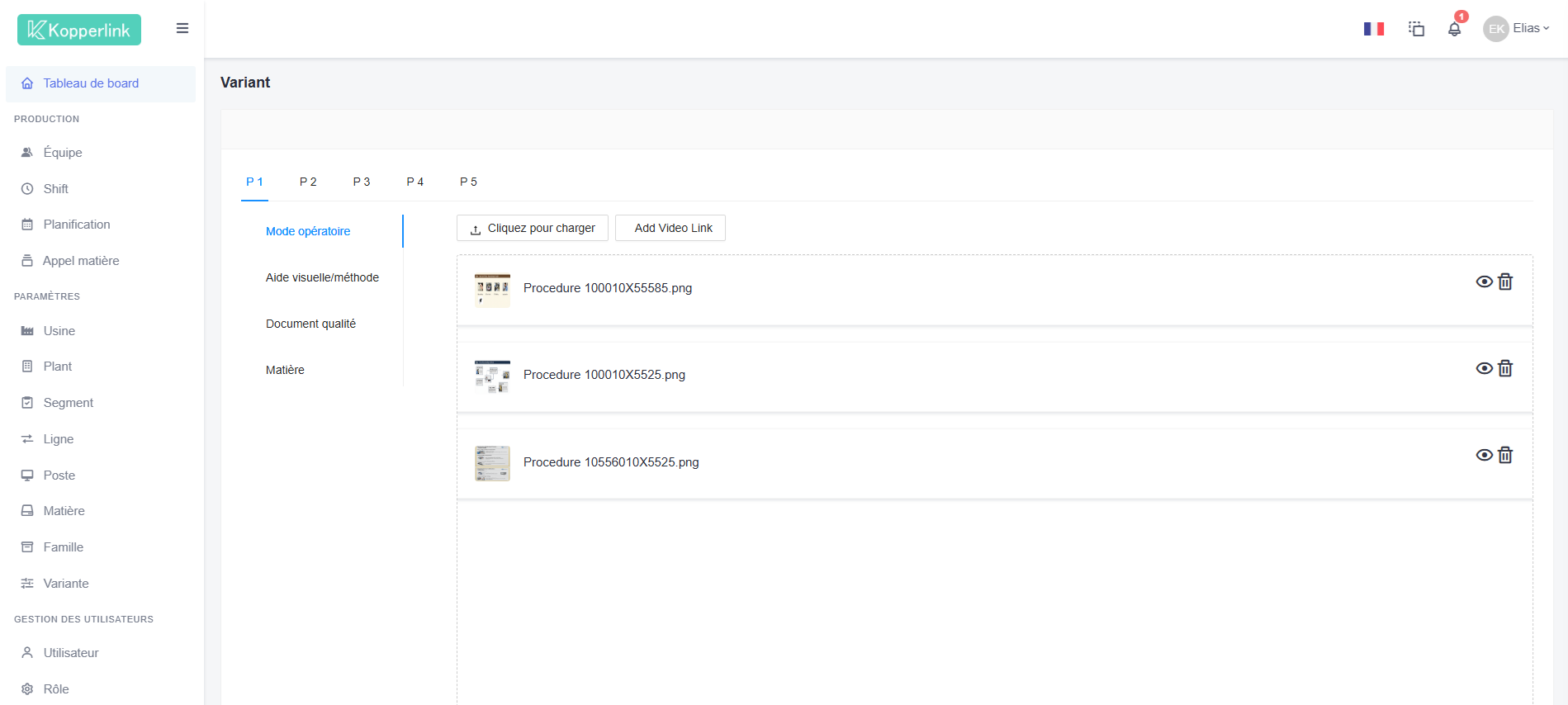 Organisation claire des documents par variante P1, P2, P3 et plus. Mode opératoire, visuel, qualité, information matière.