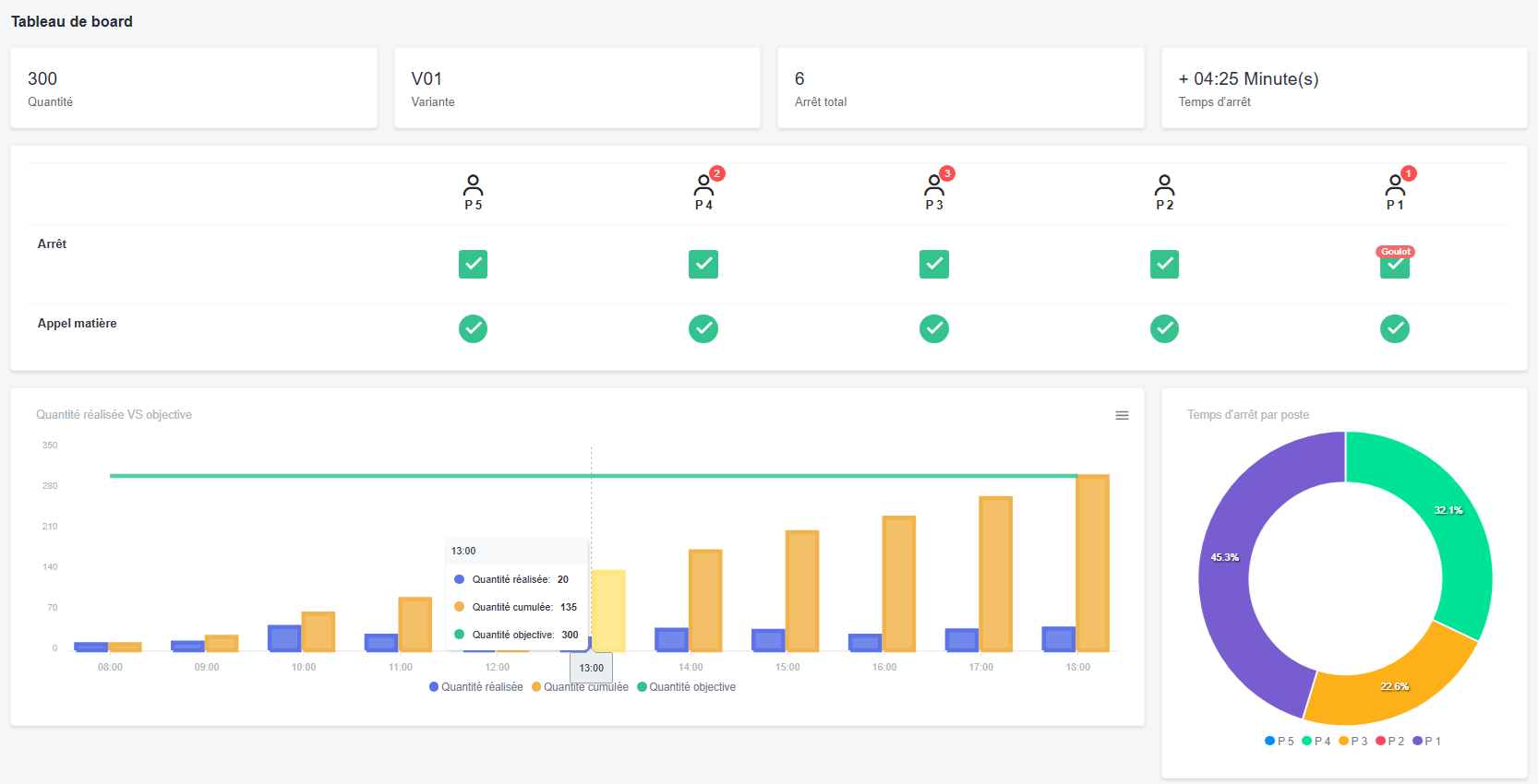 Accédez immédiatement à l’état complet de la ligne : performances, arrêts, goulots, appels matière et progression horaire, le tout sur un seul écran.